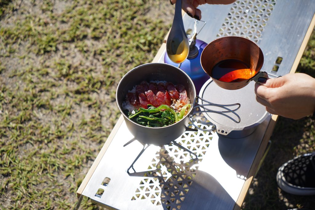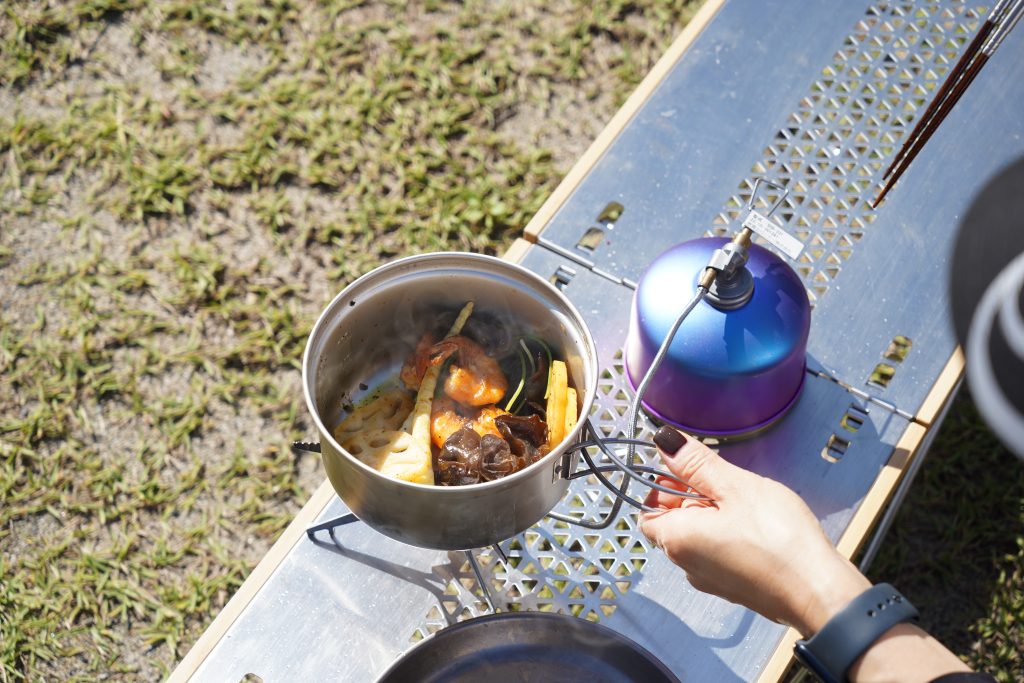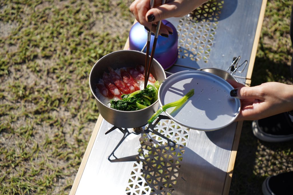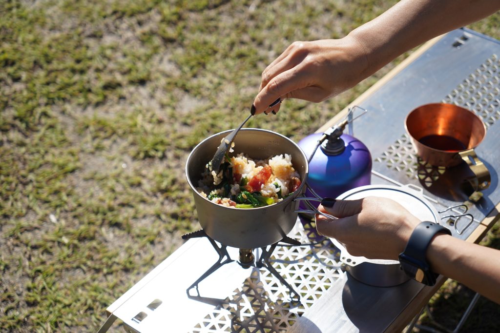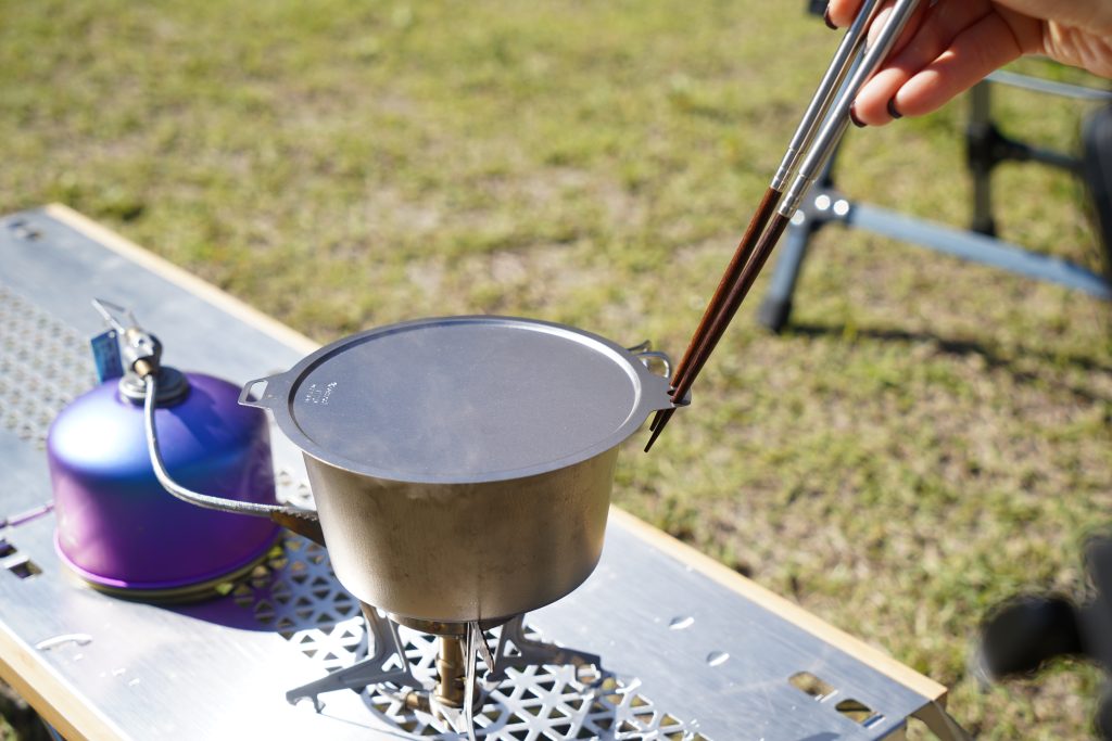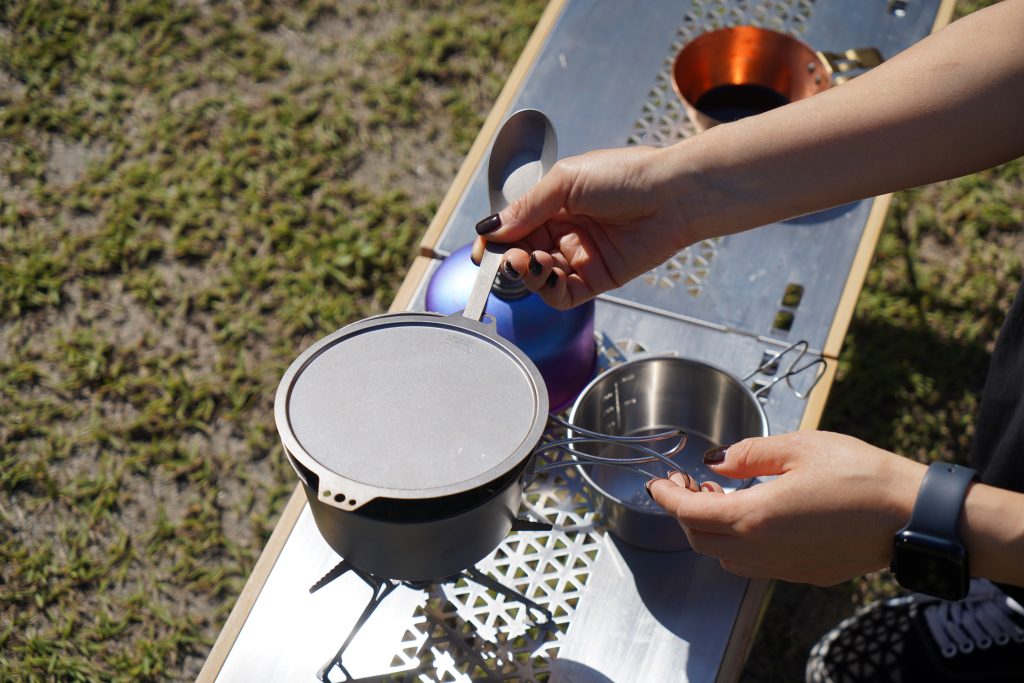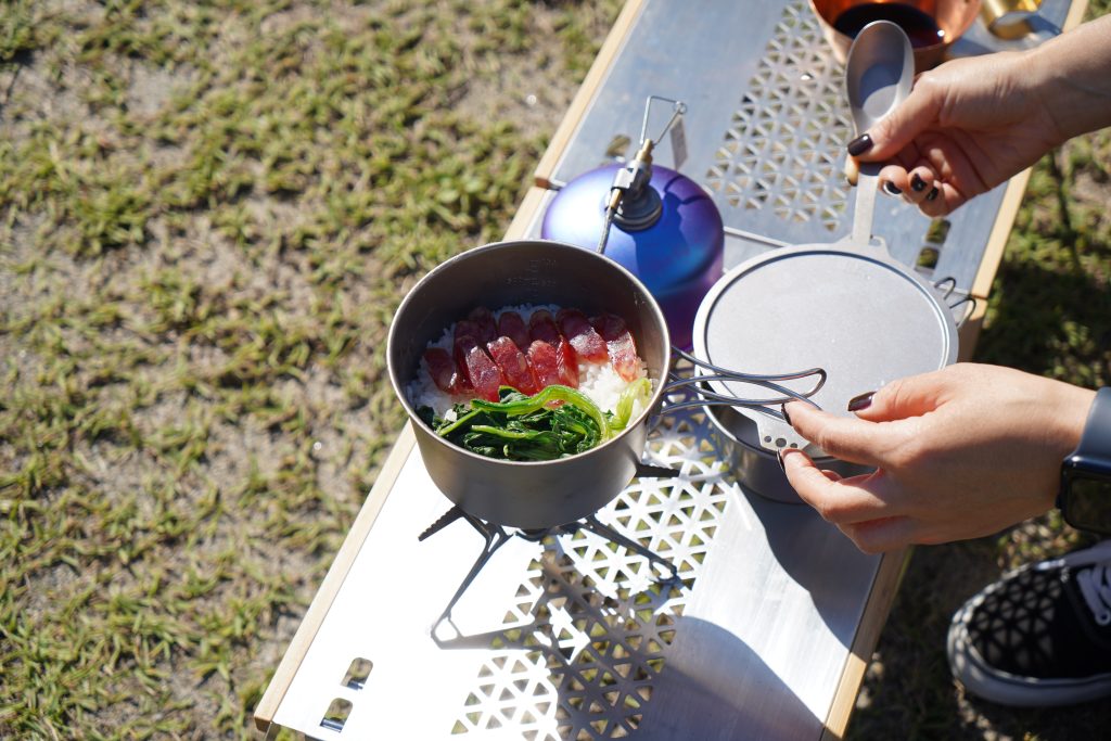 炊飯時はシェラカップリッドでしっかりフタを。このリッドは、フタとしてだけでなく、小皿・取り皿・鍋敷きとしても使える万能ギア。荷物を減らしたいキャンプでは、こうした一つで何役もこなす道具が本当に助かります🙆♂️。