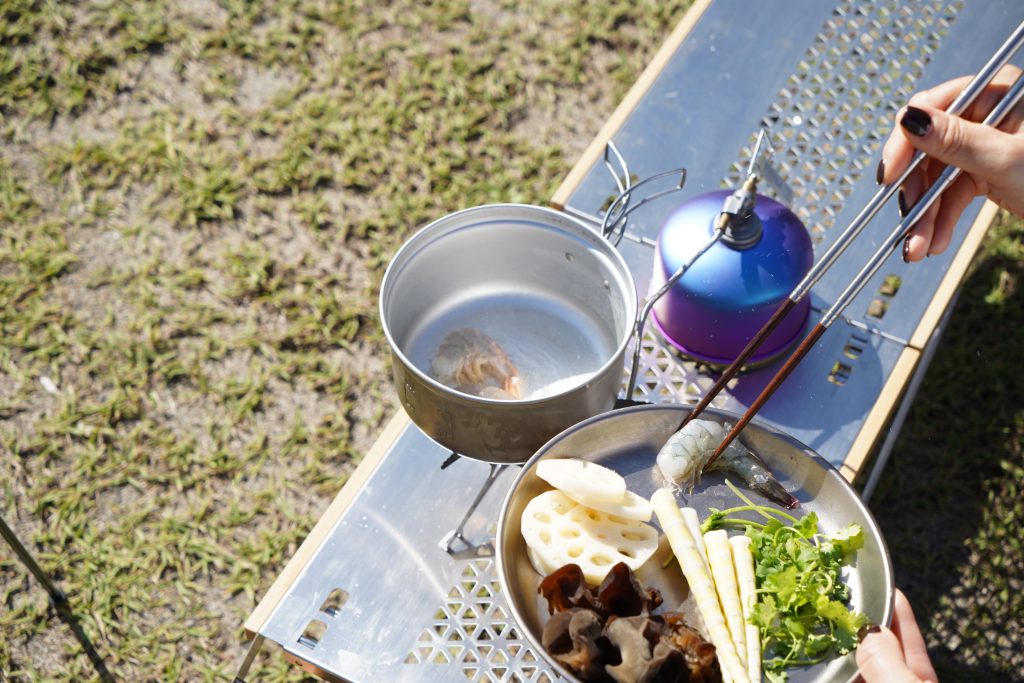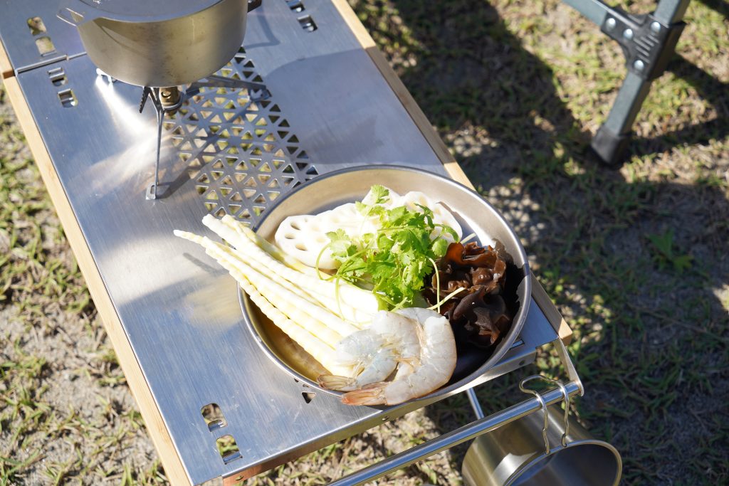Fireサイドテーブルはステンレス天板なのでバーナーを置いてもへっちゃら🦾!作業スペースがほしかったので連結🚃!手の届く範囲に置くことが出来て作業もしやすく、調理の流れもぐっとスムーズに✨