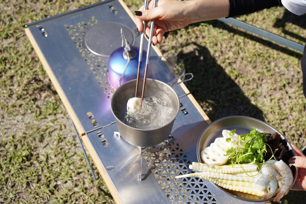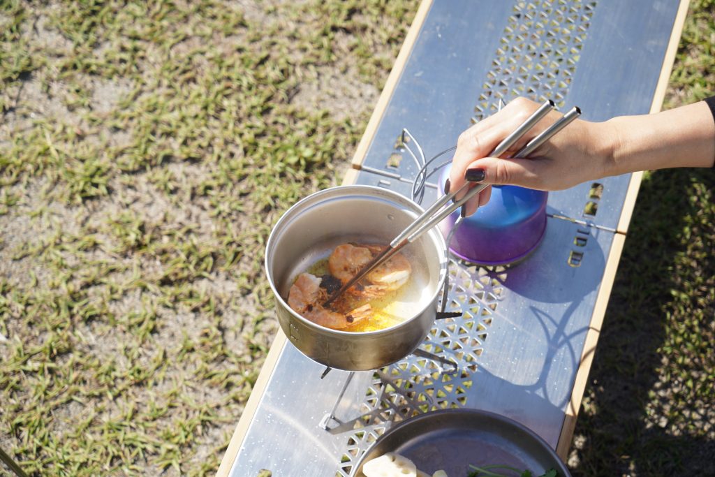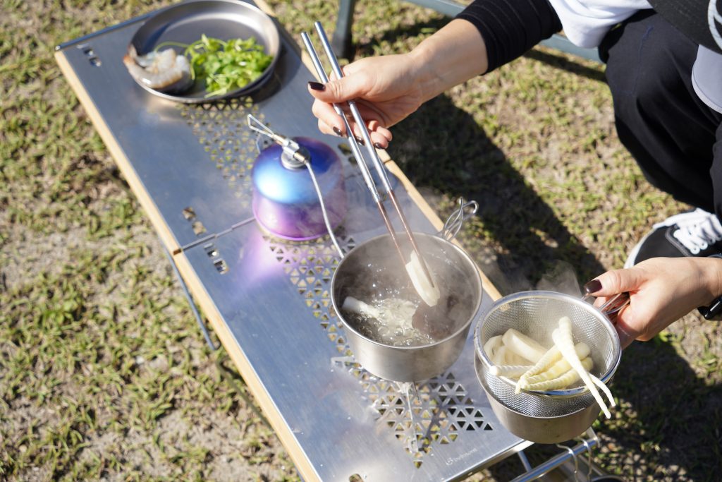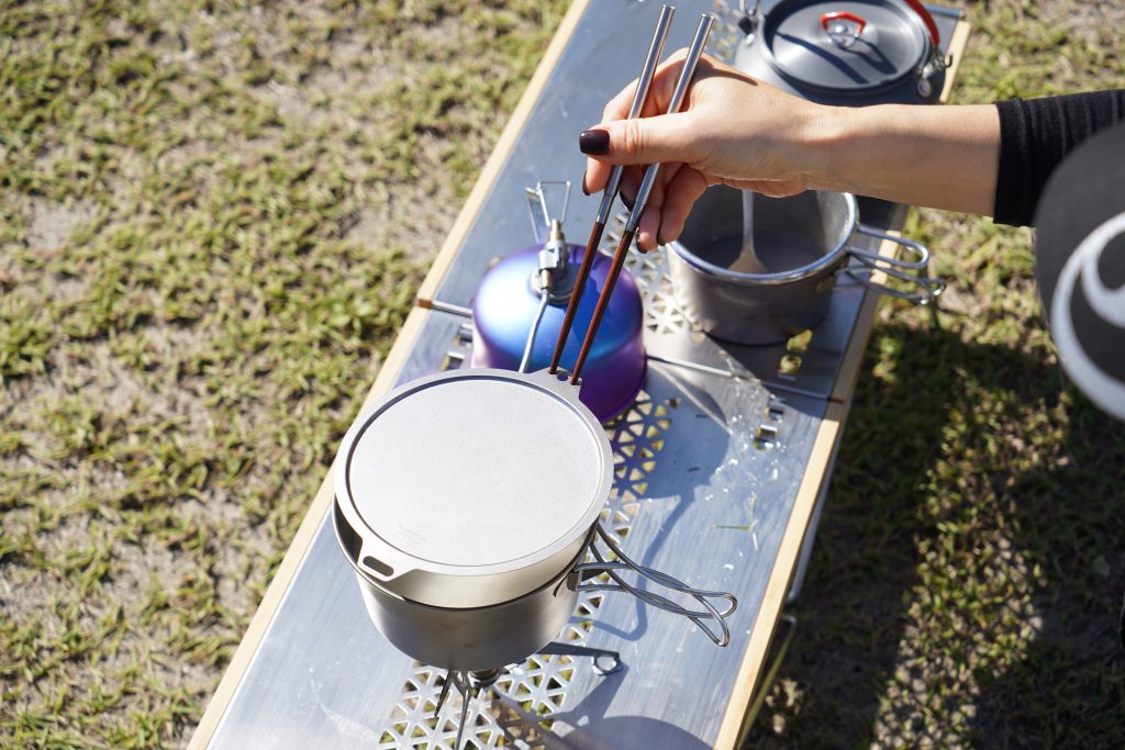ちなみにここで、今回使用している箸は2026年新商品のフィールドスティック30🥢。既存商品のフィールドスティックの長さから、テレスコ部分を引き伸ばせば菜箸に丁度良い30cmの長さに!調理のときは菜箸として使い、食事のときは22cmのお箸として使えます😚。強火で調理する中華料理にはもってこいなアイテムです!収納はフィールドスティックと同じ125mmに収まりコンパクト★