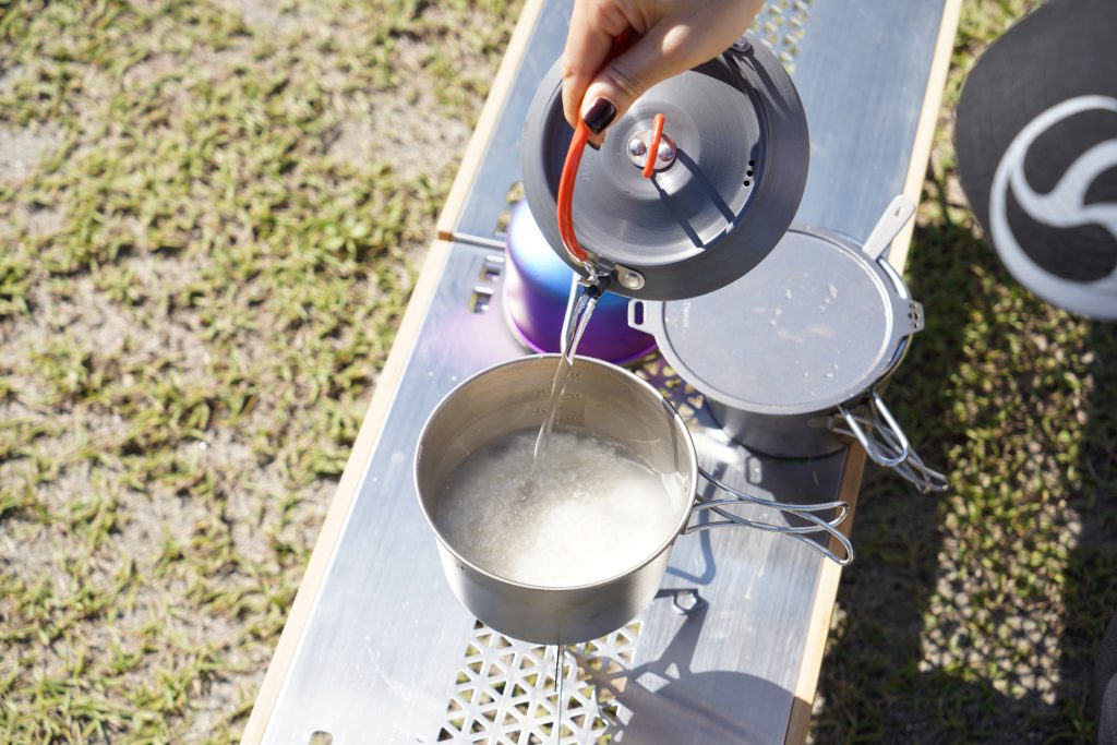 シェラカップ+シェラザルの組み合わせがあれば、お米研ぎはとてもスムーズ。特に冬キャンプでは水が冷たくなりますが、ザルがあることで手早く水切りができるのが大きなポイントです👆。