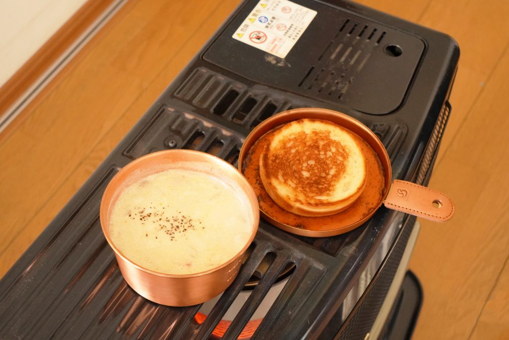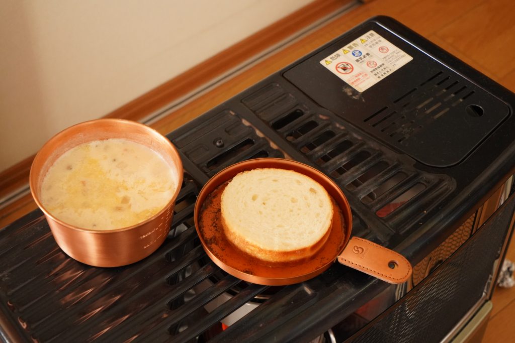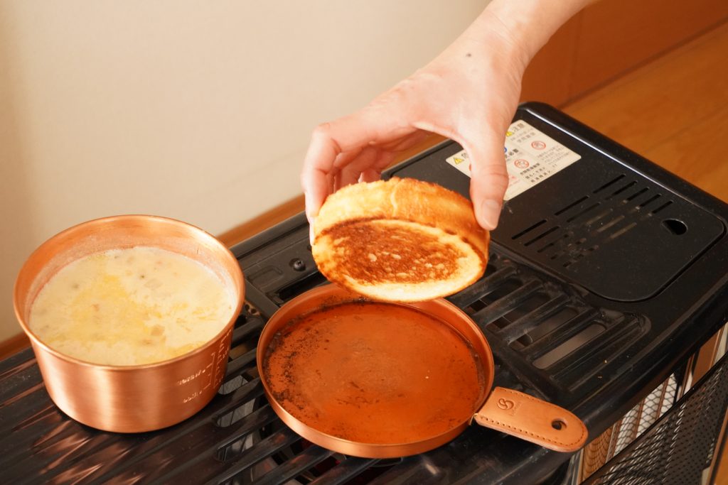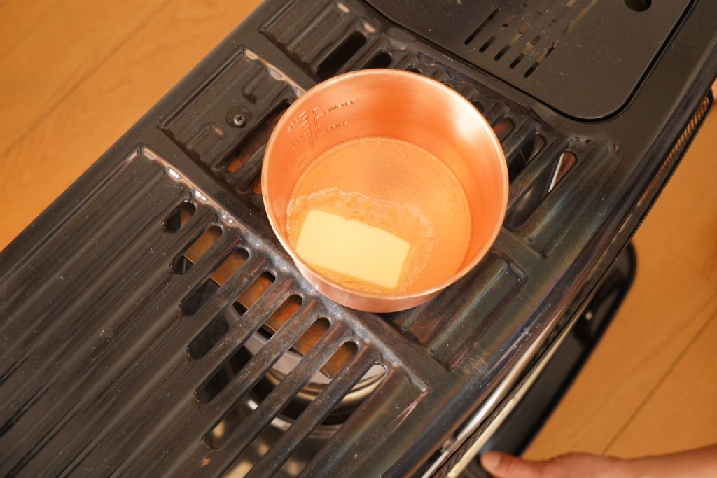ストーブの上でコッパーネストカップをゆっくりと温めてバターを落とし、材料を炒めます。じゅわっと溶けるバターの香り🧈。