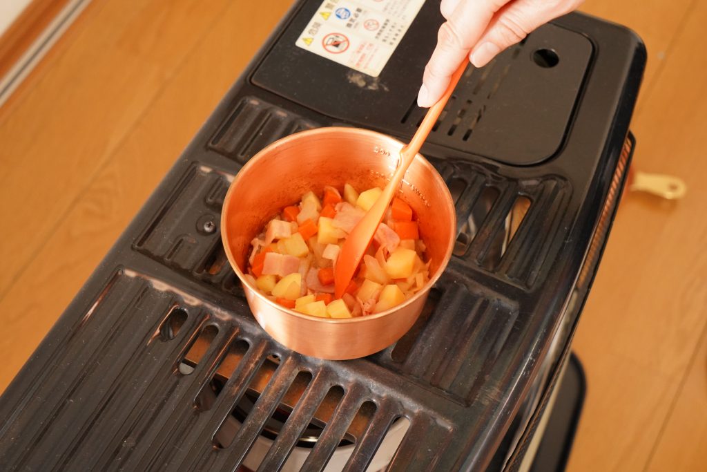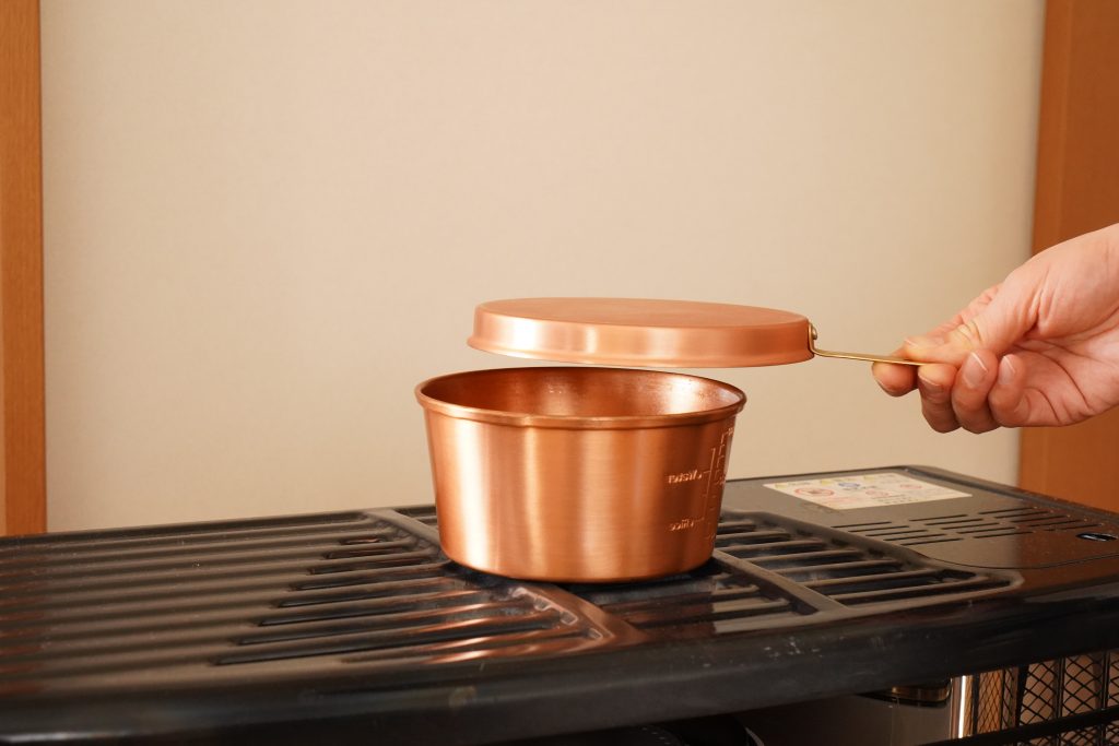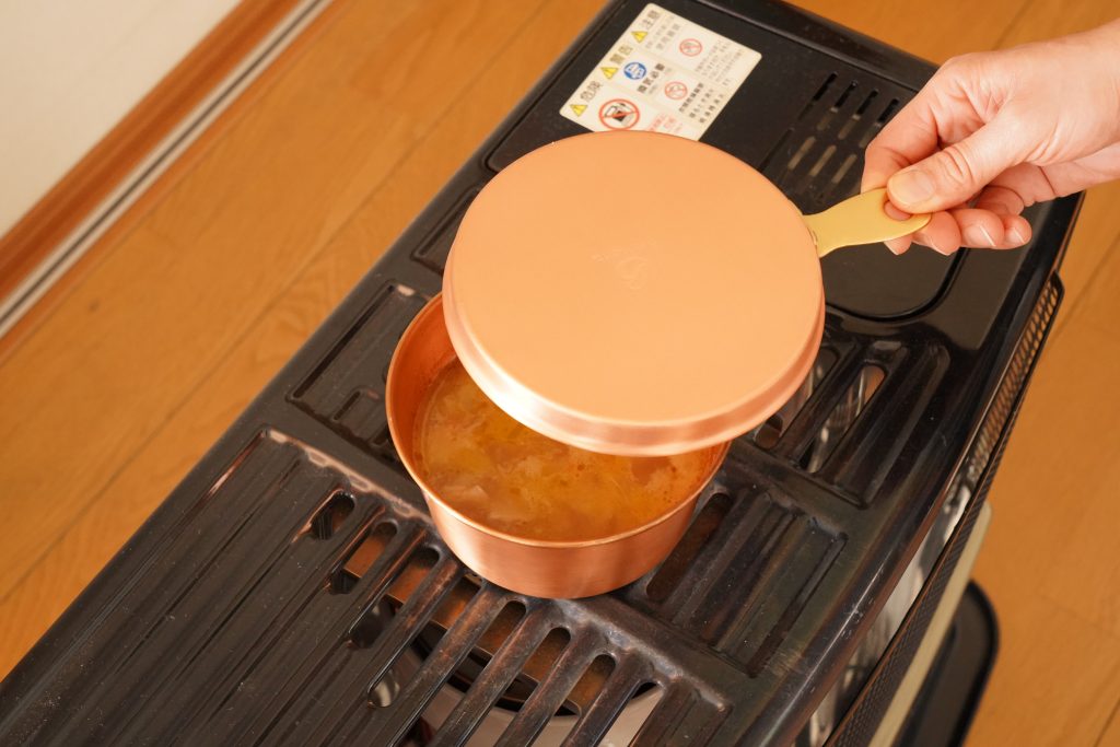 フタをして静かに煮ていきます。ぴったりと重なるこの心地よさ。銅という素材のおかげで底からやわらかく、均一に熱が伝わって具材にゆっくりと火が入っていきます。