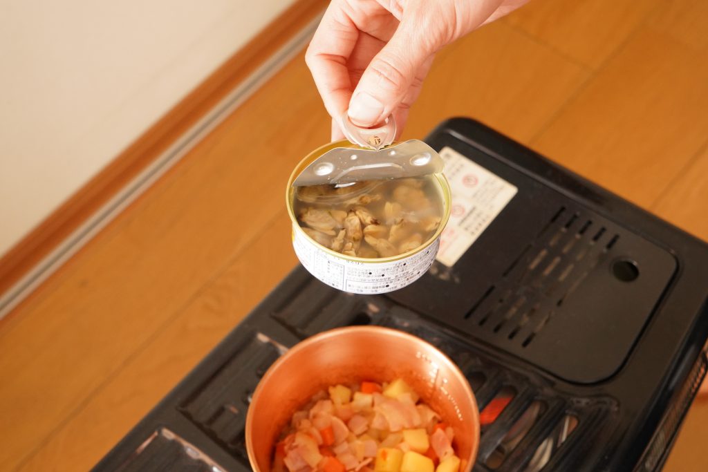 野菜をゆっくり炒めたら、アサリの水煮缶の汁と水を加えます。