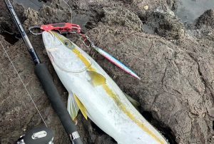 シモリがちらほらあり、魚を掛けてからのファイトは気を抜けないようなところでしたが、早速トップを投げるも反応がなく、ジグに変えて足元に落とした瞬間、何かが既にヒットしており、見事に根にスタッグしてしまいました。