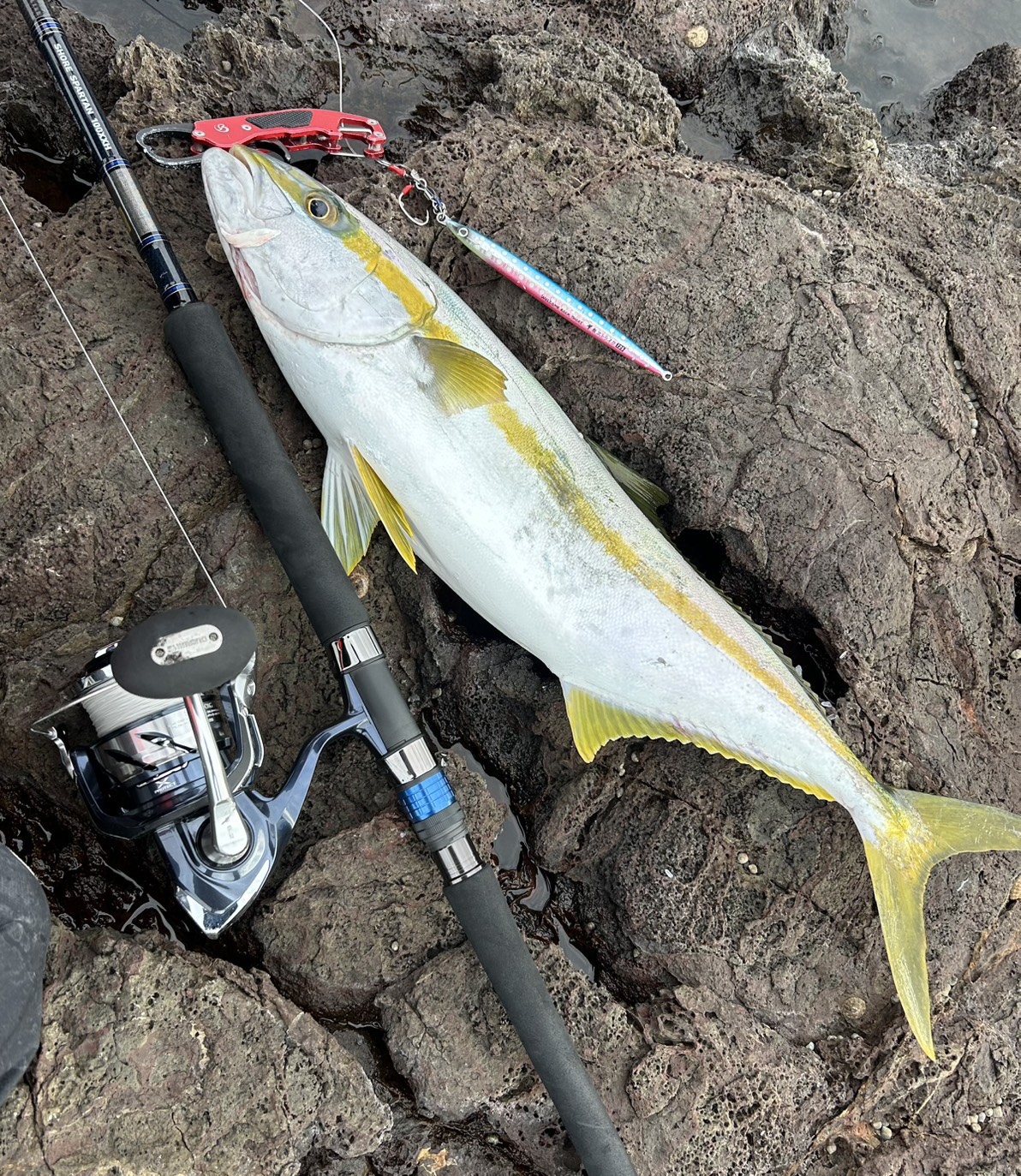 敵討ちと言わんばかりにボクもジグを続けます。一瞬でした。下から数回上げて止め、次の初動で乗りました。危なげなく浮かせ、ヒラゴサイズをキャッチ。